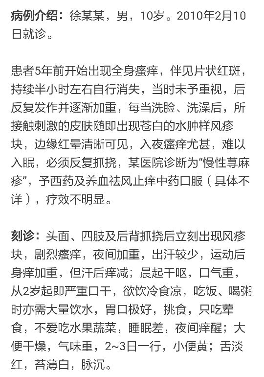 头面、四肢及后背抓挠后立刻出现风疹块,剧烈瘙痒,夜间加重,出汗较少,运动后身痒加重,但汗后痒减;晨起干呕,口气重,从2岁起即严重口干,欲饮冷食凉,吃饭、喝粥时亦需大量饮水,胃口极好,挑食,只吃荤食,不爱吃水果蔬菜,睡眠差,夜间痒醒;大便干燥,气味重,2~3日一行,小便黄;舌淡红,苔薄白,脉沉。