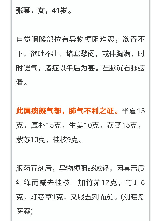 按:半夏厚朴汤主治妇女“咽中如有炙脔”,吐之不出,咽之不下,堵塞憋闷,难以忍受,又称为“梅核气”。本方解郁化痰,理气开结,确为治疗本病的良方。 案中加用桂枝,有下气降逆散结的作用。据《神农本草经》记载,桂枝有三气之功,一、能补中益气;二、能降逆下气;三、能散结行气。具体地说,例如:桂枝甘草汤,炙甘草汤中桂枝能温补心气;桂枝汤,小建中汤中的桂枝能和脾胃以健中气;而桂枝加桂汤,苓桂术甘汤等方中桂枝又能降逆下气平冲;而桃核承气汤中桂枝则能散结行气以治蓄血。 临床实践证明,用半夏厚朴汤治疗痰气交郁的梅核气,如不能取效时,加上桂枝每每能收到良好的效果。所以,本案中加桂枝,取其散结气,降逆气之功。 《金匮要略•妇人杂病脉证并治第二十二》:妇人咽中如有炙脔,半夏厚朴汤主之。 各家论述 《医宗金鉴》:此病得于七情郁气,凝涎而生,故用半夏、厚朴、生姜辛以散结,苦以降逆,茯苓佐半夏,以利饮行涎,紫苏芳香,以宣通郁气,俾气舒涎去,病自愈矣。 《金匮方歌括》:方中半夏降逆气,厚朴解结气,茯苓消痰;尤妙以生姜通神明,助正祛邪;以紫苏之辛香,散其郁气。郁散气行,而凝结焉有不化哉。