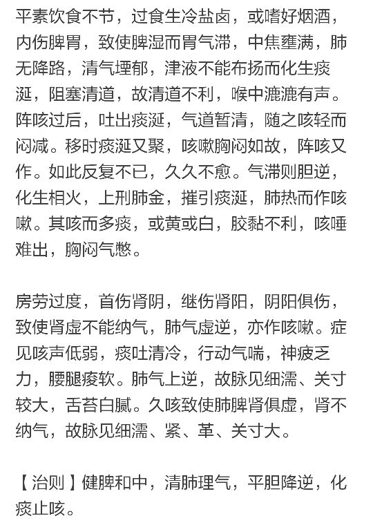 外感咳嗽一旦转为内伤咳嗽,多成痼疾。内伤咳嗽多系肺脾肾俱虚。药后咳痰喘嗽虽可大减,甚至一如常人,但其根难除,每因气候突变或劳累而急性发作。经年不愈,甚则迁延而成痰饮咳嗽,咳嗽吐血者。