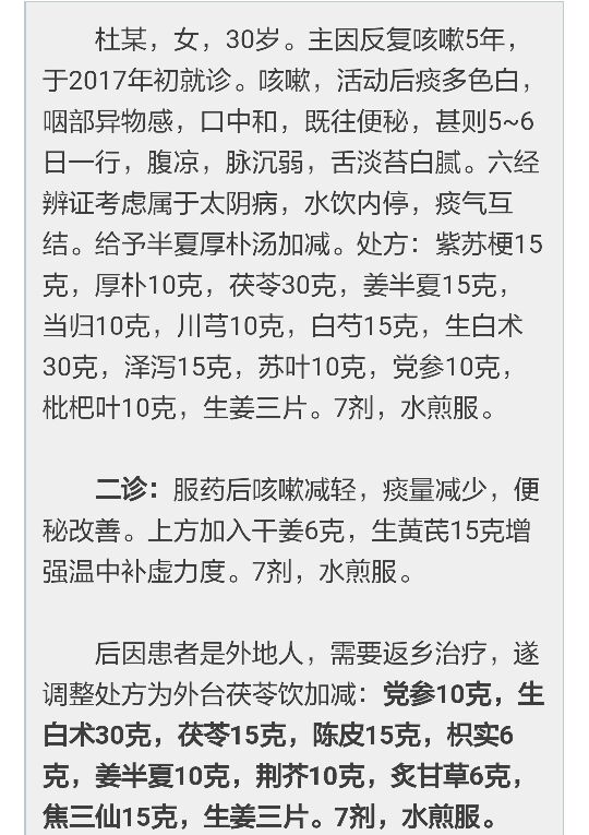 服药1周后,诉咳嗽较前明显减轻,以偶有欲清利咽部感觉而咳为表现,痰白量少而易咯出。咽部异物感已消失。纳食可,大便2日一行,小便可。发来舌苔照片,仍舌淡苔薄白略腻。嘱上方去荆芥,加苏叶6克,苏梗10克,佩兰10克。煎煮时加入生姜三大片。继续服用调理。后来患者电话告知,症状大为改善,身体状况良好。