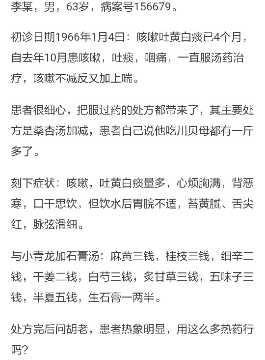 胡老说:“患者吃了那么多清热药而症状越来越重,已说明药不对证。再看他现在的症状,有背恶寒,饮水后胃脘不适,为内有停饮之征。