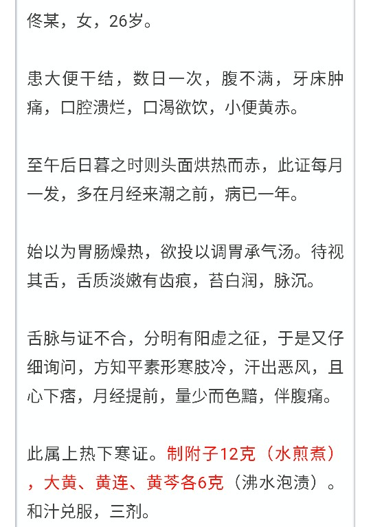 服药后牙痛,口渴,汗出,心下痞等证均消,大便转常。按往常月经应提前而至,但此次没有提前。 上方加附子为15克,又服三剂后,月经按期而至。 学习经典 《伤寒论》第156条:心下痞,而复恶寒汗出者,附子泻心汤主之。 各家论述 刘渡舟:附子泻心汤由大黄黄连泻心汤加炮附子而成,《伤寒论》中用来治疗“心下痞,而复恶寒,汗出者”,其病机特点是火热邪气内盛而人体真阳又虚。 从表面看来,这是一种不相协调的矛盾对立,阳盛则热,阳虚则寒,为什么阳虚能与热邪同存于一体之中? 如果从上下水火阴阳既济系统来看,中焦气机不能斡旋于上下,固然能产生上热下寒的格局。但是,如果从阳气与邪火的关系上来理解附子泻心汤证,似乎更能触及病变的本质。 《素问•阴阳应象大论》说:“壮火之气衰,少火之气壮。壮火食气,气食少火;壮火散气,少火生气’。这段话为我们理解邪气与阳气的关系提供了理论依据。 “少火”(即生命活动之火)是周身阳气产生的根源,是维持人体正常生理活动的基本保证,所以说“少火生气”。而“壮火”(即“邪火”)则是“少火”的克星,它不但能“食气’, 而且能“散气”。 在邪火内盛的病理情况下,如果它不断地蚕食人体的“少火”,就能逐渐导致阳气虚衰。阳愈衰则火愈盛,火愈盛则阳愈衰,形成了一个不良的循环体,而在这个循环体中,邪火旺盛是最为关键的因素。 所以,如果要打破这个循环体,恢复人体的阳气,单用扶阳的方法显然是达不到目的的,只有在消除邪火的同时,采用温补阳气的方法,双管齐下,才能收到良好的效果。 也就是说,只有在“壮火之气衰”的前提下,才能使“少火之气壮”,这也正是附子泻心汤一方面用三黄清热泻火,另一方面用附子温补真阳的治疗主导思想。 用这种观点来认识附子泻心汤证的病机形成原理以及附子泻心汤的组方原则,对于在临床上更好地把握本方的运用无疑是有益的。 《古方选注》:用三黄彻三焦而泻热,即用附子彻上下以温经。三黄用麻沸汤渍,附子别煮汁,是取三黄之气轻,附子之力重,其义仍在乎救亡阳也。 《伤寒贯珠集》:按此证,邪热有余而正阳不足,设治邪而遗正,则恶寒益甚,若补阳而遗热,则痞满愈增。此方寒热补泻并投互治,诚不得已之苦心,然使无法以制之,鲜不混而无功矣。方以麻沸汤渍寒药,别煮附子取汁,合和与服,则寒热异其气,生熟异其性,药虽同行,而功则各奏,乃先圣之妙用也。