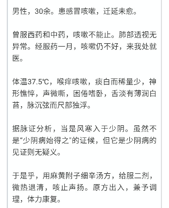 风寒侵入少阴,肺气上逆而咳嗽,此属太少两感证。 《张氏医通》说:“暴哑声不出,咽痛异常,卒然而起,或欲咳不能咳,或无痰,或清痰上溢,脉多沉紧,或数疾无伦,此大寒犯肾也,麻黄附子细辛汤温之,并以蜜制附子噙之,慎不可轻用寒凉之剂。” 学习经典 《伤寒论》第301条:少阴病,始得之,反发热,脉沉者,麻黄细辛附子汤主之。 各家论述 《注解伤寒论》:麻黄之甘以解少阴之寒,细辛、附子之辛以温少阴之经。 《医方集解》:以附子温少阴之经,以麻黄散太阳之寒而发汗,以细辛肾经表药联属其间,是汗剂之重者。 《古方选注》:用麻黄发太阳之表汗,细辛散少阴之浮热,相须为用。欲其引麻黄入于少阴,以出太阳陷入之邪,尤借熟附合表里以温经,外护太阳之刚气,内固少阴之肾根,则津液内守,而微阳不致外亡,此从里达表,由阴出阳之剂也。