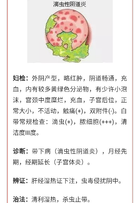 诊断:带下病(滴虫性阴道炎),月经先期,经期延长(子宫体炎)。