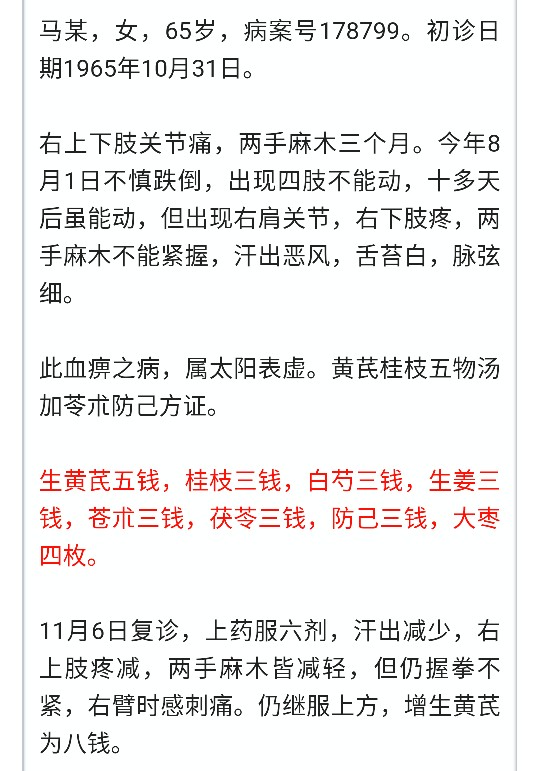 马某,女,65岁,病案号178799。初诊日期1965年10月31日。 右上下肢关节痛,两手麻木三个月。今年8月1日不慎跌倒,出现四肢不能动,十多天后虽能动,但出现右肩关节,右下肢疼,两手麻木不能紧握,汗出恶风,舌苔白,脉弦细。 此血痹之病,属太阳表虚。黄芪桂枝五物汤加苓朮防己方证。 生黄芪五钱,桂枝三钱,白芍三钱,生姜三钱,苍朮三钱,茯苓三钱,防己三钱,大枣四枚。 11月6日复诊,上药服六剂,汗出减少,右上肢疼减,两手麻木皆减轻,但仍握拳不紧,右臂时感刺痛。仍继服上方,增生黄芪为八钱。 11月20日三诊,汗出已很少,两手麻木明显减轻,左手已能正常握拳,右手仍不能紧捏,右臂外侧刺痛减。仍继服上方12剂,诸症已。 学习经典 《金匮要略•血痹虚劳病脉证并治第六》:血痹,阴阳俱微,寸口关上微,尺中小紧,外证身体不仁,如风痹状,黄芪桂枝五物汤主之。 各家论述 《医宗金鉴》:以黄芪固卫;芍药养阴;桂枝调和营卫,托实表里,驱邪外出;佐以生姜宣胃;大枣益脾,为至当不易之治也。