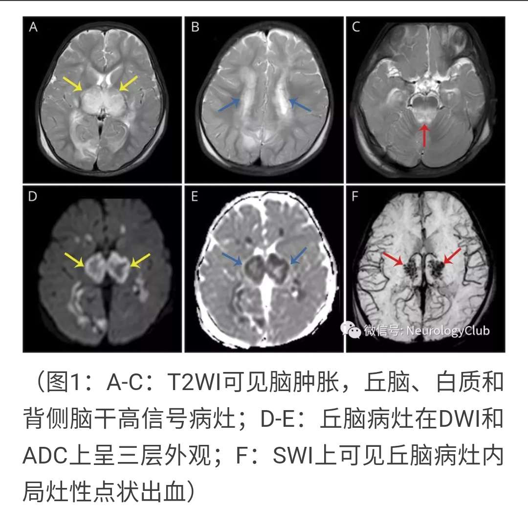 10月大婴儿,因癫痫持续状态就诊,2天前有发热和稀便。头颅MRI提示脑组织肿胀和累及丘脑,白质和背侧脑干的T2高信号病灶(图1)。丘脑病变在DWI和ADC上可见三层外观,伴有SWI上可见的局灶出血(图1-2)。 最终诊断:急性坏死性脑病 讨论 儿童急性坏死性脑病是一种爆发性脑病,主要累及婴幼儿。诱发因素包括病毒感染(流感病毒,轮状病毒,人类疱疹病毒6),免疫介导和遗传(RANBP2突变)。DWI和ADC上的三层表现和对称性丘脑受累具有特征性。
