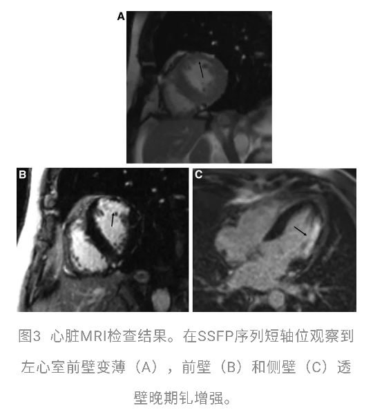 (4)诊断线索来自于对其兄长病历的回顾,病历显示其兄长为持续性VT伴左束支传导阻滞图形(图2)。MRI显示右心室游离壁底部心肌被脂肪替代以及游离壁中存在少量微动脉瘤,左心室正常,其兄长被诊断为致心律失常性右心室心肌病/发育不良(ARVC/D)。这名患者,MRI显示左心室前外侧壁变薄,伴运动不能,心内膜下和透壁晚期钆增强(图3)。右心室收缩功能正常,流出道区疑似轻度运动障碍,游离壁有少量微动脉瘤。