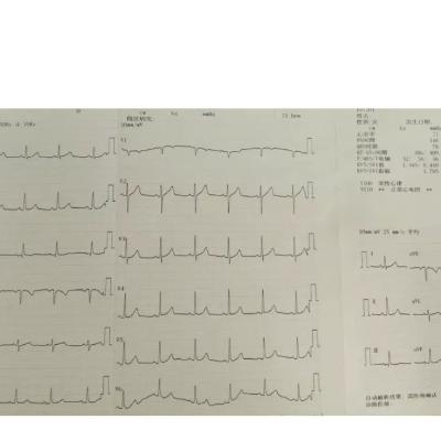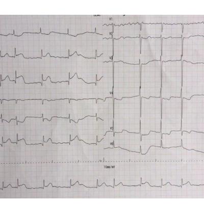 进入急诊室时,患者神志清醒。血压84/67 mmHg。无充血性心力衰竭的临床症状。心电图示宽QRS波心动过速,速率为210/min(图1A)。静脉注射腺苷(6~12 mg)对心动过速无效。随后,患者接受了200J的同步电击,窦性心律恢复(70次/min),QRS波较窄,在下壁导联和胸前V3~V6导联中,ST段压低2 mm,T波倒置(图1B))。