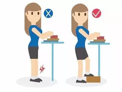 改善方法:工作时脚下踩垫脚物,并双脚轮替,可以缓解腰背部肌肉紧张。如果长期站立,还可以做一些腰部伸展的动作。