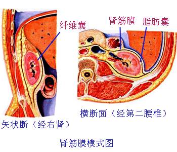 3.肾筋膜(renal fascia) 围绕肾脂肪囊外,肾筋膜分前、后两层,包绕肾和肾上腺。两层在肾上腺上方和肾的外侧缘处互相融合。在肾的下方两层分开,其间有输尿管通过。在肾的内侧,前层在肾和肾血管前面向内侧延伸,至腹主动脉和下腔静脉的前面与对侧肾筋膜前层相续,后层与腰大肌筋膜融合。肾筋膜向深面发出许多结缔组织小束,穿过脂肪囊连于纤维囊,对肾起固定作用。