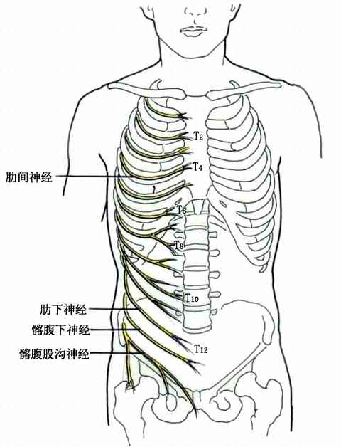 胸神经前支共12对。除第1对的大部分参加臂丛,第12对的少部分参加腰丛外,其余不形成神经丛。第1~11对胸神经位于各自相应的肋间隙称为肋间神经,第12对胸神经前支位于第12肋下方,故名肋下神经。肋间神经伴随肋间后血管,在肋间内、外肌之间,沿肋沟行走。下5对肋间神经远侧部和肋下神经斜向下内,行于腹内斜肌与腹横肌之间,并进入腹直肌鞘。肋间神经和肋下神经的肌支分布于肋间肌和腹前外侧肌群,皮支分布于胸、腹壁皮肤及相应的壁胸膜和壁腹膜。