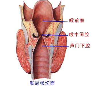 喉腔可借前庭襞和声襞分为三部分:①喉口至前庭裂平面间的部分称喉前庭,上宽下窄,前壁主要由会厌的喉面构成。②前庭裂平面至声门裂平面间的部分称喉中间腔,在喉腔的三部分中,喉中间腔容积最狭小。其向两侧突出的梭形隐窝,称喉室。③声门裂平面至环状软骨下缘平面之间的部分称声门下腔,向下通气管。声门下腔处粘膜下组织比较疏松,故炎症时易引起喉水肿;婴幼儿因喉腔较窄小,水肿时易引起喉阻塞,造成呼吸困难。