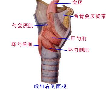 喉肌均为骨骼肌,肌块细小,附着于喉软骨的内面和外面。根据喉肌的功能可分为两群。一群作用于环甲关节,使甲状软骨产生前倾和复位的运动,以紧张或松弛声韧带;另一群作用于环杓关节,使杓状软骨沿垂直轴旋转,从而扩大或缩小声门裂。因此喉肌的运动可控制发音的强弱和调节音调的高低。环甲肌起自环状软骨弓前外侧面,向后上止于甲状软骨下缘和下角,作用是紧张声带。环杓后肌起自环状软骨板后面,向外上止于杓状软骨肌突,有开大声门裂并紧张声带作用。