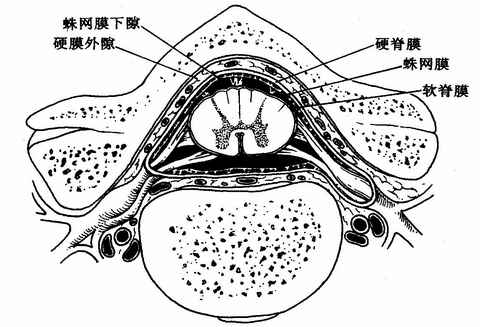 (2)蛛网膜 位于硬膜的深面,薄而透明,无血管和神经。蛛网膜与软膜之间有蛛网膜下隙,隙内充满脑脊液,此隙在某些部位扩大,称蛛网膜下池。蛛网膜下池在脑部的称脑池;在脊髓末端至第2骶椎平面之间的称终池。终池内有马尾而无脊髓,临床常在此处穿刺抽取脑脊液。