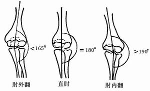 伸肘正位片上,肱骨、尺骨长轴线形成向外165°~170°的夹角,此为生理性前臂外翻角,男性一般大于女性。若小于l65°叫肘外翻,大于190°叫肘内翻,如果是180°则叫直肘(图1-1),均属异常表现。肱骨长轴与尺骨长轴在内下方的夹角谓之提携角,正常范围5°~20°之间,女大于男。