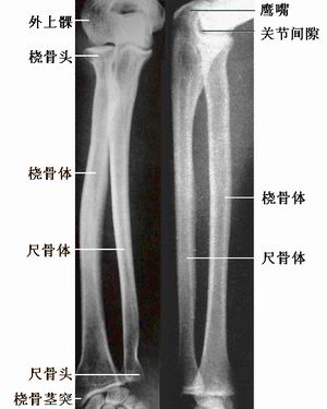 前臂骨的X线解剖 常规摄前后位、侧位片。前后位片上(图2),两骨并行,尺骨在内侧,桡骨在外侧。桡骨上端的桡骨头呈圆盘状,桡骨颈下方的内侧缘显示三角致密影为桡骨粗隆影。尺骨上端大而不规则,主要参与构成肘关节。尺骨下端变细,尺骨头内后侧有尺骨茎突影。前臂侧位片,尺、桡骨上、下两端都显示部分重叠,但骨干分开,桡骨干后缘和尺骨前缘之间显示长梭形空白区,为透亮的骨间膜。