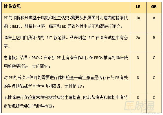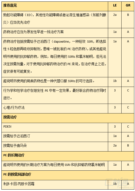 早泄(PE)定义为较短的射精潜伏期和不能延迟射精所造成的障碍。对早泄的管理可涉及行为和/或药物的治疗。EAU 2015 男性性功能障碍推荐表格中对PE的诊疗推荐如下: