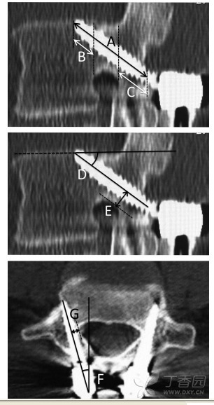 图 1 CT 显示 CBT 螺钉的进钉轨迹,上图主要测量椎弓根螺钉的长度:A 进入骨质中的螺钉长度 ;B 椎体内的螺钉长度; C 椎板内螺钉长度;中图及下图主要测量螺钉与椎弓根的关系:D 螺钉头倾角度; E 螺钉距椎弓根下界距离 ;F 螺钉外展角 G 螺钉距椎弓根内侧壁距离