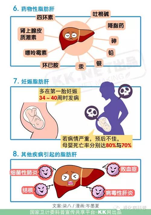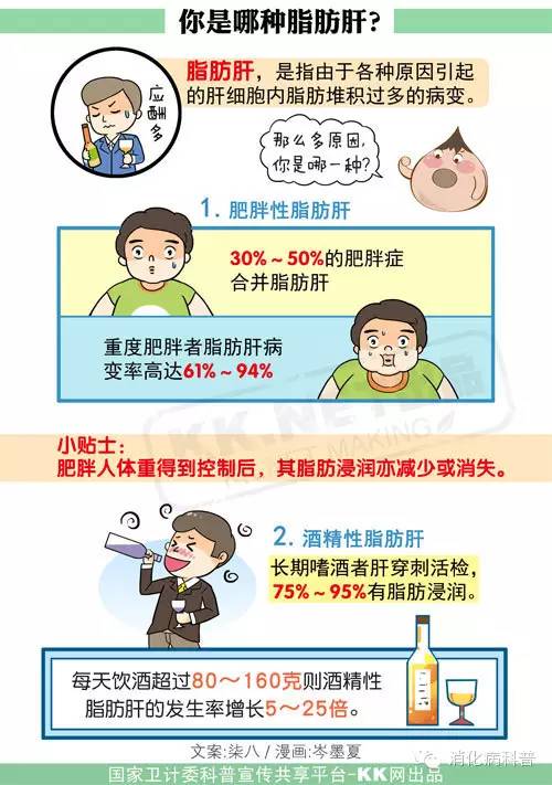 脂肪肝可以有很多种原因导致(见漫画),最常见的原因有肥胖和酗酒,因此根据患者有无过量饮酒史,分酒精性脂肪性肝病和非酒精性脂肪性肝病。