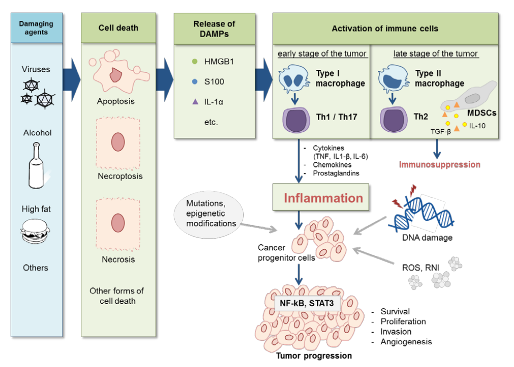 临床数据及动物模型提示,肝细胞死亡是慢性肝病向肝纤维化及癌症进展的关键因素。细胞死亡的不同模式,如凋亡、坏死及坏死样凋亡,是启动特异性细胞死亡应答及促进肝病进程的特异机制。尚未完全阐明的是,通过某些致病因素如病毒感染或脂肪性变性,可特异性激活何种细胞死亡。然而,在大部分慢性肝病中只有小比例肝细胞同时死亡。这种情况下,细胞死亡对肝功能没有显著的直接影响。作为代替的是,对细胞死亡的肝组织应答常表现为持续数十年,并向确定的长期结局及临床转归的发展。如死亡细胞释放的HMGB1,也被称为DAMPs,可在组织损伤后经由如RAGE或TLRs的受体启动无菌性炎症。随着巨噬细胞及其他炎症因子的激活,HMGB1/RAGE信号通路显示出直接促进卵圆细胞及癌变细胞增生,提示慢性损伤中DAMPs与HCC之间的存在直接联系。