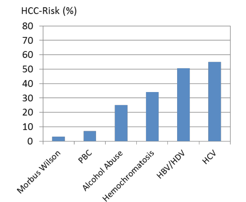 日本一项基于HCV相关肝纤维化患者的研究提示,HCC发生率增高与肝纤维等级相关,F3或更高纤维化等级的HCV患者应当常规监测HCC。相似的,慢性肝病患者中瞬时弹性成像检测的肝硬度值与HCC的风险相关,也提示了弹性成像在HCC危险度分层中的作用。