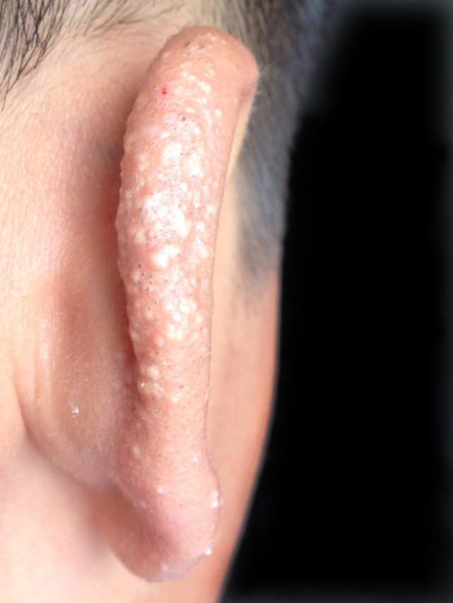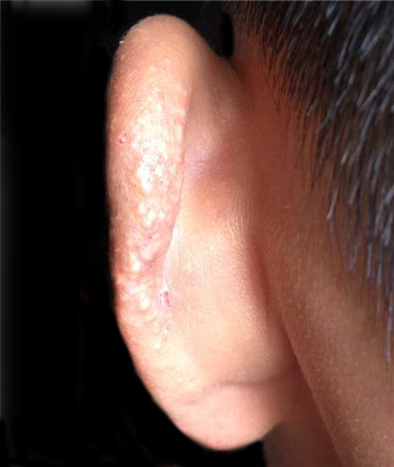 患者男,19岁。因双侧耳廓后外侧白色丘疹、斑块,反复发作1年余就诊。患者诉皮疹初为白色、黄色针尖至粟米大小丘疹,偶感瘙痒,春季发病,后皮损缓慢增多,增大,部分融合,未予治疗,至当年9月皮疹逐渐自行消退,次年入冬后,皮疹再次出现,稍感红肿,瘙痒。追问病史,患者祖籍西南某市,入伍至寒区作训以来,双耳廓“冻疮”病史2年。否认局部外伤史及用药史,否认家族中有类似疾病患者。发育正常,系统检查未见明显异常。皮肤科检查:双耳廓后外侧见成片密集分布白色、淡黄色丘疹及斑块,直径约1~4mm,部分融合成斑块(图1),其他部位未见类似皮疹。患者拒绝对皮损行组织病理检查。临床诊断:斑块状粟丘疹。治疗予盐酸米诺环素胶囊(商品名:玫满)口服,阿达帕林凝胶(商品名:达芙文)外用2周,皮疹未见明显改变,红肿稍减退,计划待皮损稳定后,进一步行二氧化碳激光治疗。