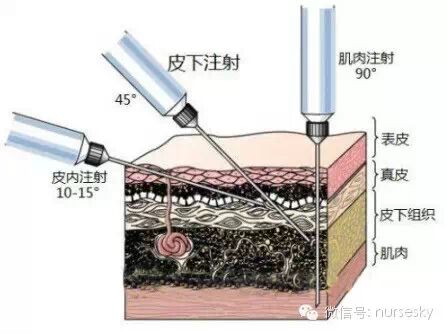 3.以左手绷紧皮肤(过瘦者捏起皮肤),右手持注射器排尽空气,针头与皮肤成30度-40度斜向刺入皮下,左手放松,稍稍抽动活塞,无回血即可推注药液。