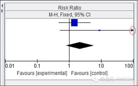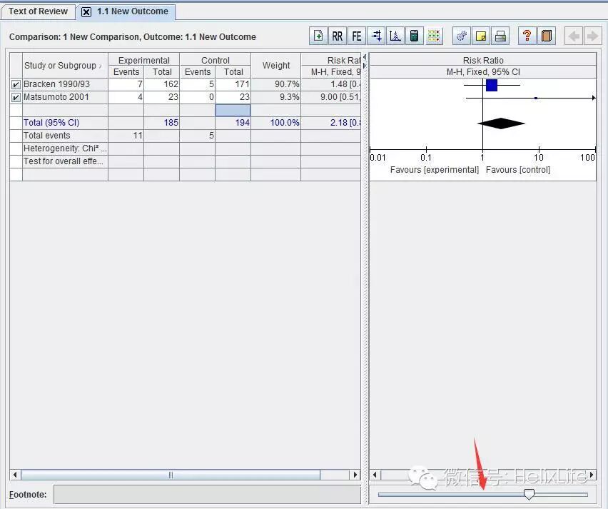 不要紧,这实际上反映了第二个纳入研究有一部分可信区间超过了最大值100,没有办法在这张图中完全显示出来。让我们拉动下图所示的按钮调节一下横坐标,直到范围大于可信区间的范围,这个箭头就消失了。这样子做出来的森林图是蓝黑的,大多数情况下你是不愿意支付彩图的额外费用的,这时候你就需要运用PS把整幅图变成黑白的。