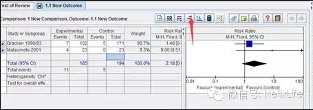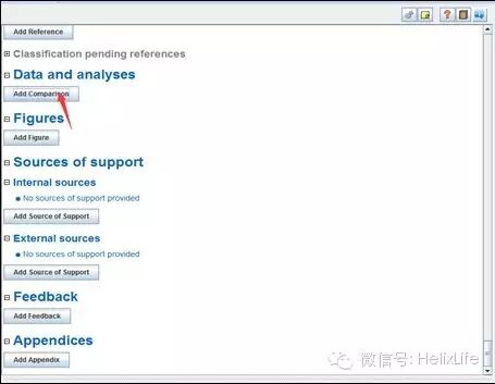 如下图所示,首先在左边栏里单击“Data and analysis”,然后在右边栏里点击“Add Comparison”,填写完相关项目后一个比较就出来了。提醒大家的是一个比较下面是可以有多个结局指标的,同样一个结局指标上面是可以有多个比较的,因此我们在描述结果还是要看清楚再写的。