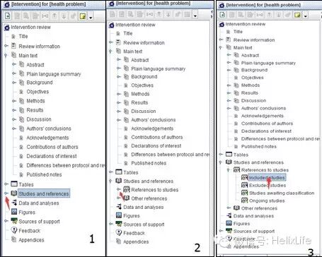 在打开我们的软件之后,我们新建一个文件,点击“create a new review”(新建),接下来创建一个最普通的“Intervention review”(勾选),我们进行相关项目的填写(如果仅仅是使用该软件的统计分析功能,可以不填),选择制作“Full Review” 然后点击Finish就ok了。如果我们的目标仅仅是画纳入研究的质量评估图或者是流程图,我们可以选择Protocol而不去使用软件的计算功能,Protocol状态下不能使用其统计计算功能。然后如下图所示,在屏幕左边的条目里依次点击至Included studies。