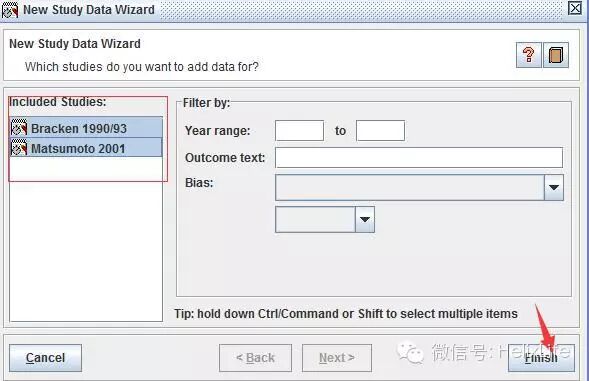 如下图红线所示,选中需要纳入的研究。RevMan这里有一个好处,有时候你会发现新检索出来了文献,这时无需重做,可以把新研究选中直接添加进来即可。