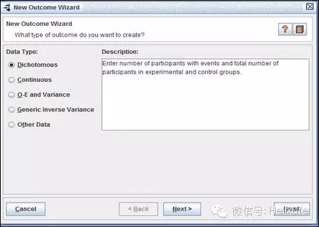 添加结局指标的时候注意变量的选择(应该熟悉每个英文及其里面的子项目所代表的变量类型)和统计方法的选择,下面那张图中我们应当选择Dichotomous(二分类变量)。