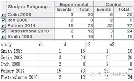 其次就是数据的准备工作了,采用Excel管理数据足矣。RevMan最新版本软件是支持直接复制粘贴数据的,我们按要求整理好数据,直接从Excel复制上去就好了。我们首先看看RevMan来处理二分类数据(所谓二分类数据,就是取值只有是或否两种可能)。