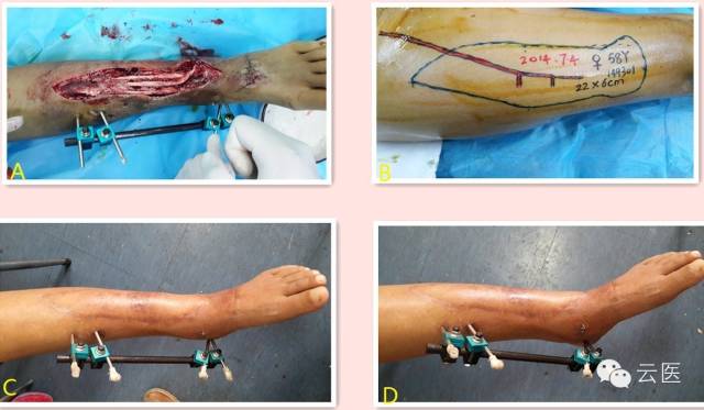 一位42岁女性患者因车祸致伤左小腿2H入院术后胫前皮肤坏死 B..设计对侧股前外侧皮瓣CD.术后两月复查皮瓣存活好外形满意。病例详情请至云医#病例讨论#版块查看。