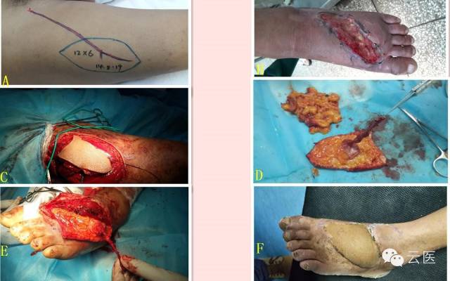 一位26岁男性患者,车祸伤导致前足皮肤软组织缺损,术前设计股前外侧皮瓣, B.术前足背创面情况C.术中皮瓣血运D.术中皮瓣消除脂肪。E.削脂后皮瓣F.术后三周皮瓣存活好。病例详情请至云医#病例讨论#版块查看。