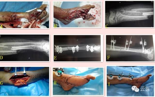 一位52岁男性患者,巨石砸伤致左胫腓骨开放性骨折第一趾毁损离断A.受伤时左足创面情况B.受伤左胫腓骨开放骨折GustiloⅡ型C.术前胫腓骨上段X线D.术前胫腓骨下段x线E.术后正位x线F.术后侧位x线。G.设计对侧腓动脉穿支皮瓣术中显露情况H.术中血运I.术后10天皮瓣存活。病例详情请至云医#病例讨论#版块查看。