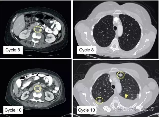 图 1. 指定患者予 BYL719 治疗后的临床反应 CT 扫描显示稳定(反应),完成第十周期的 BYL719 治疗后出现主动脉旁淋巴结转移(黄色圈、左列)和肺部新的病灶(黄色圈、右列),箭头所示为胸膜渗出
