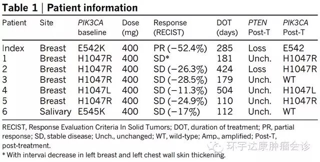 一位诊断为浸润性导管癌的 60 岁患者经乳腺癌根治术后行化疗联合芳香化酶抑制剂依西美坦治疗,4 年后出现骨转移并开始雌激素受体拮抗剂氟维司群治疗,病情稳定。治疗进行 18 个月后,疾病进展,出现肝脏、骨、淋巴结转移。他们对她的原发肿瘤组织档案进行 PCR 分析,检测到 PIK3CA(E542K)热点突变。