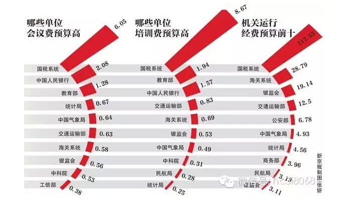 记者梳理发现,国税系统的机关运行经费最为“庞大”,达117.53亿元;海关系统次之,为28.79亿元;银监会19.14亿元。交通运输部的机关运行经费也达12.50亿元。