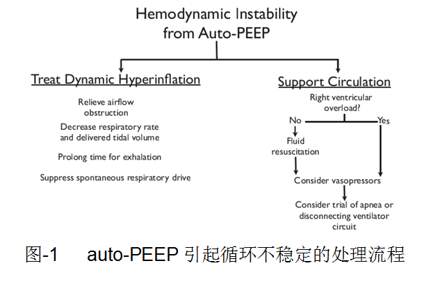 反映肺过度充气程度最客观的指标是FRC,但测定很繁琐,临床上极少应用。通常使用auto-PEEP来反映呼气末肺整体的过度充气状态,因测定非常简单、方便,成为了危重患者较常应用的测定指标。当患者肺过度充气程度与auto-PEEP测定值极不相符时,可以实施窒息试验(Trial of Apnea)。具体方法:在使用镇静-肌松剂,充分抑制患者自主呼吸的情况下,吸纯氧3~4min,在吸气末开始呼气,使呼气时间延长至30~60s,使气体充分呼出。窒息试验让肺泡达到更充分排气,同时让肺内压力更均匀。窒息试验主要用于过度充气和气体陷闭的判断,可反映疾病本身所致气流阻塞的严重程度。当auto-PEEP影响循环时,也可以使用窒息试验(图-1)。