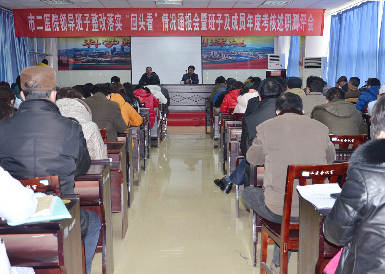 本报讯(龙章凤) 1月30日下午,医院在四楼大会议室召开党的群众路线教育实践活动整改落实情况“回头看”通报会暨班子及成员年度考核述职测评会。会议由党委书记李健主持,怀化医院全体院领导、党员、入党积极分子、职能部门负责人、科主任、护士长、班组长以及洪江医院与靖州医院代表共约120余人参加了此次大会。