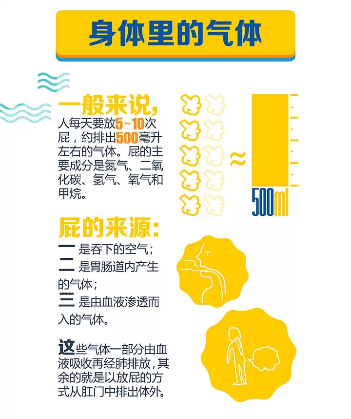 一般来说,人每天要放5~10次屁,约排出500ml左右的气体。屁的主要成分是氮气、二氧化碳、氢气、氧气和甲烷。