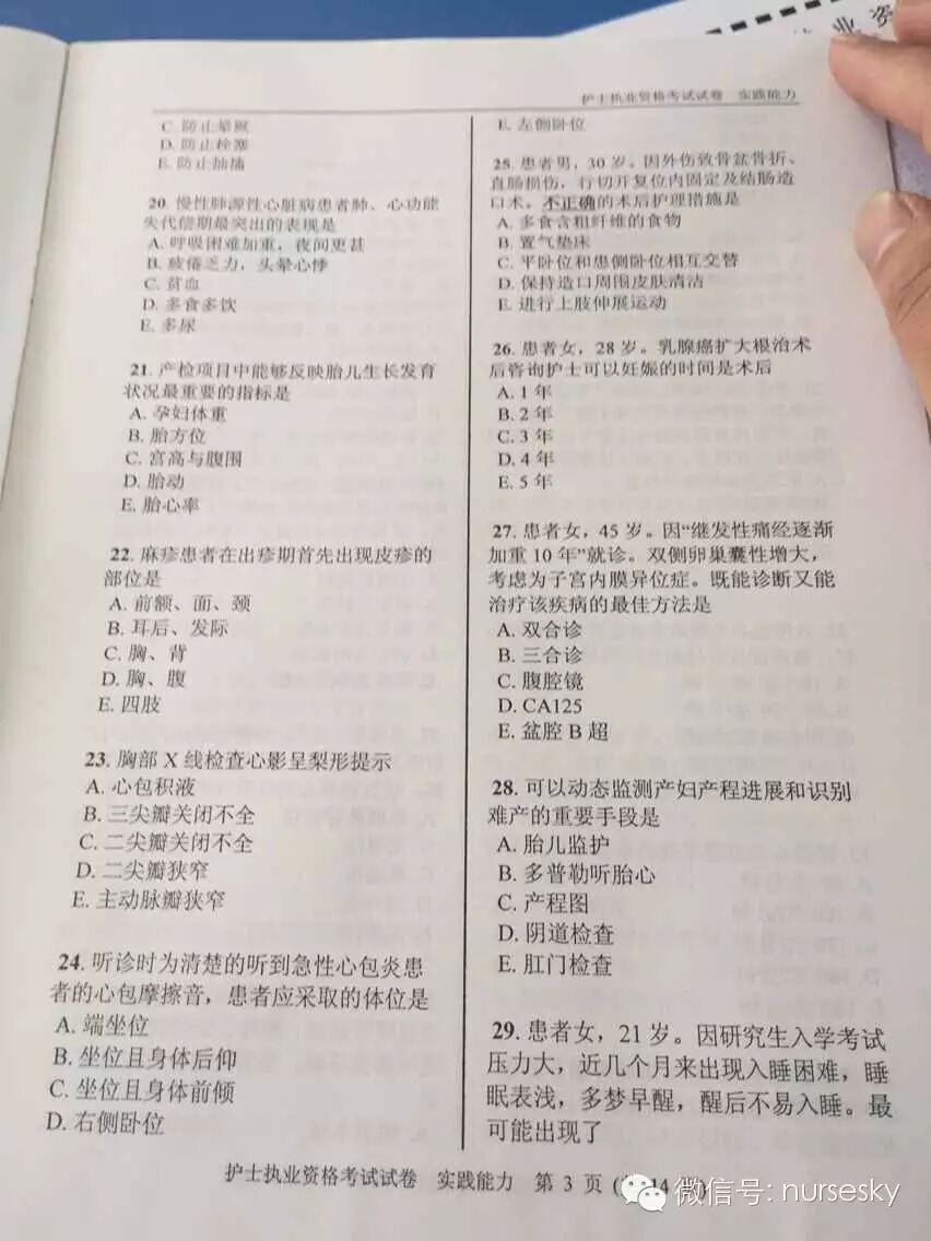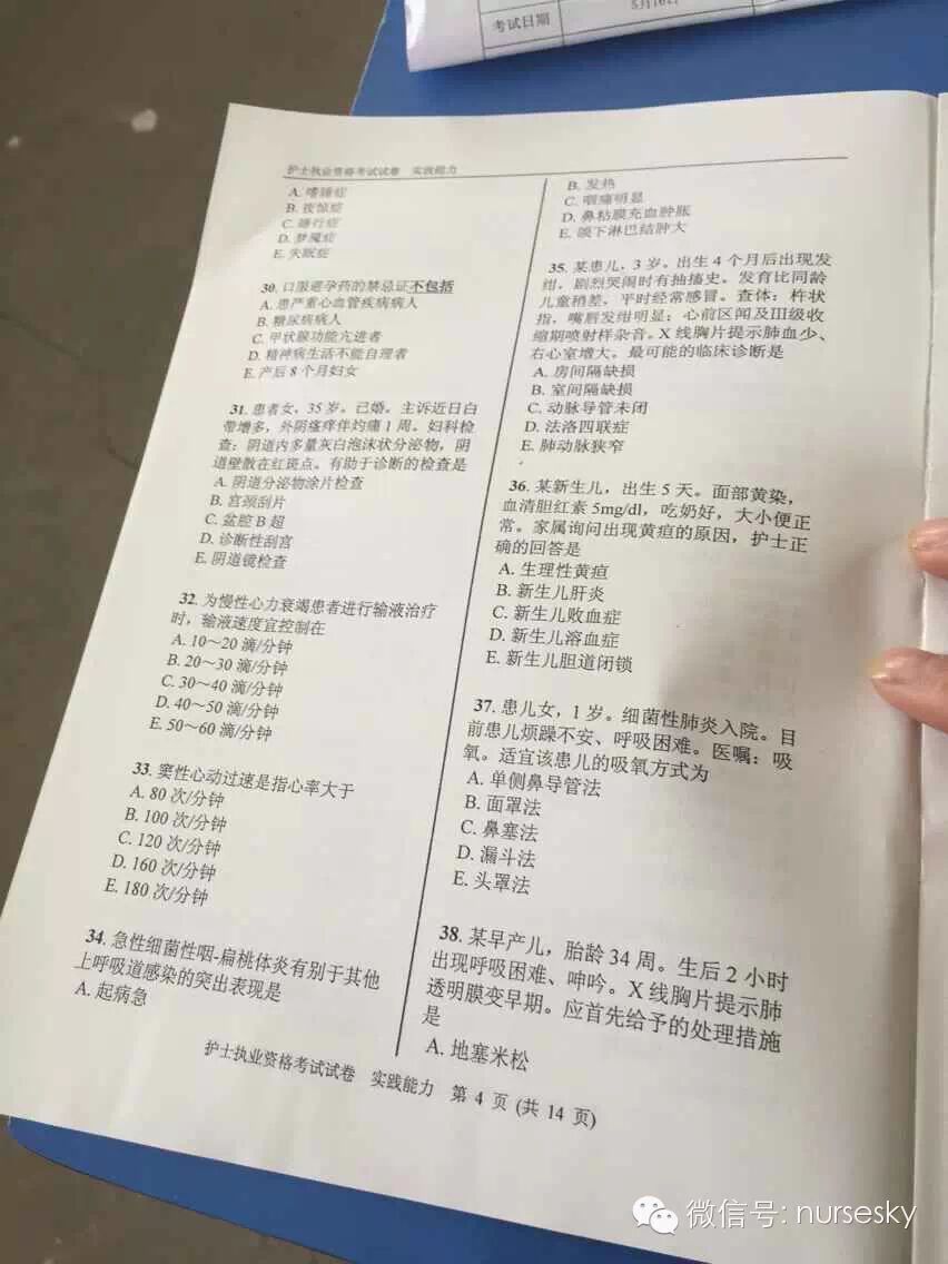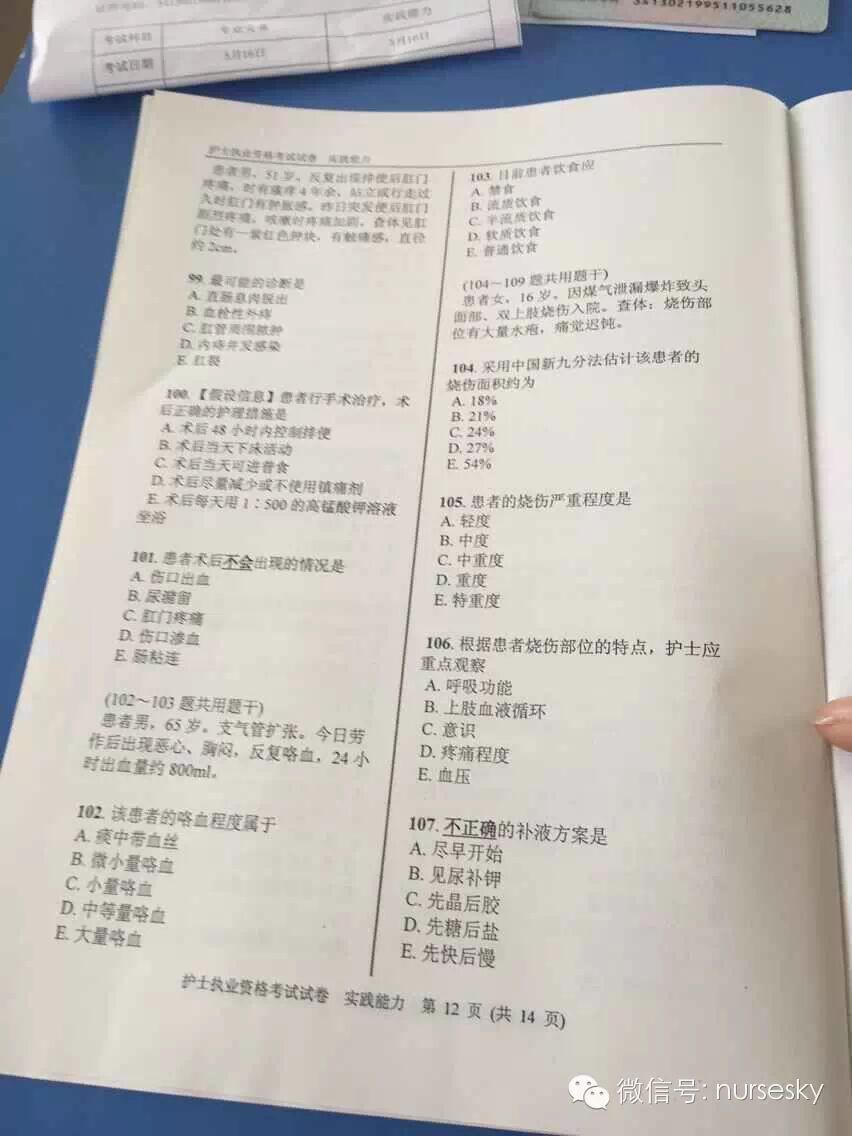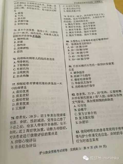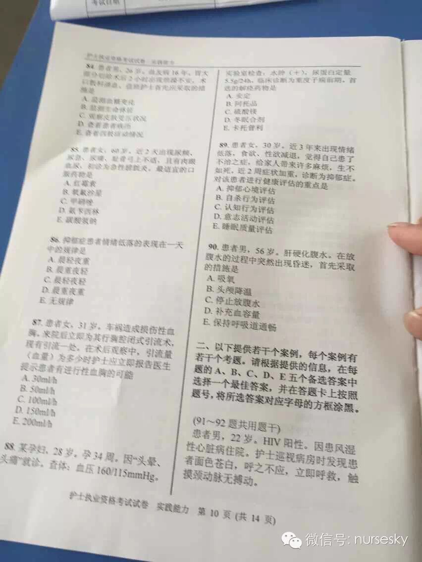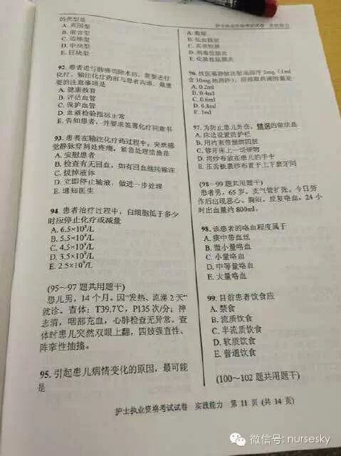 提示:以下为部分网友提供的2015年护士资格考试实践能力真题试卷图文版及答案,中国护士网微信暂不做任何说明,仅供大家参考所需。