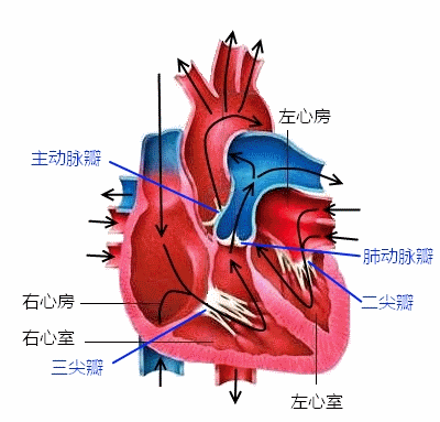黑色箭头所指为血液流动方向,蓝色箭头所指为瓣膜